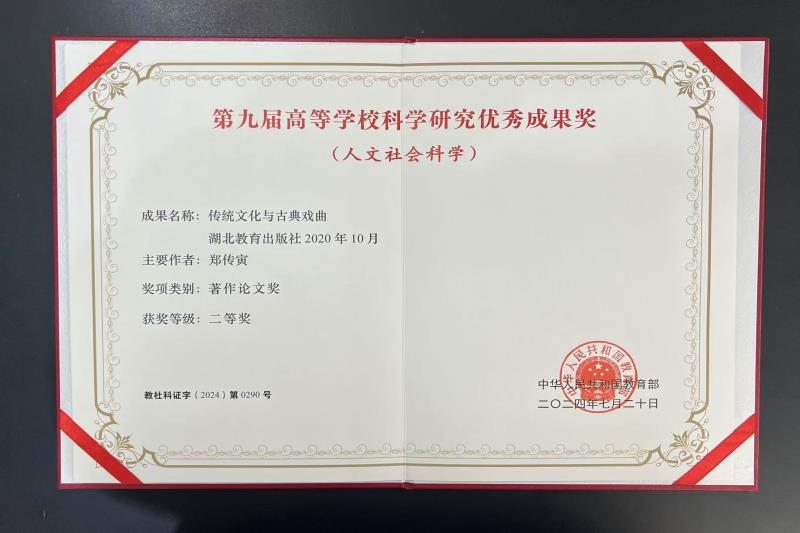 《傳統(tǒng)文化與古典戲曲》榮獲第九屆高等學校科學研究優(yōu)秀成果獎(人文社會科學)著作論文獎二等獎