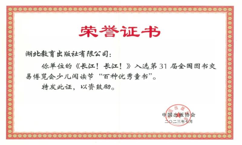 由湖北教育出版社出版的《長江!長江!》榮獲第31屆全國圖書交易博覽會少兒閱讀節“百種優秀童書”。