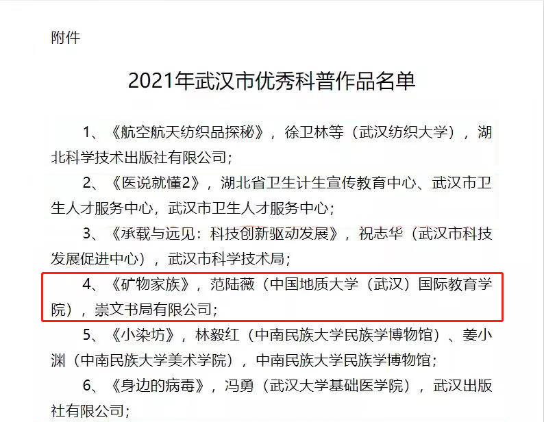 近日,武漢市科學技術局公布了2021年武漢市優秀科普作品名單,共23部作品,我社《礦物家族》入選。