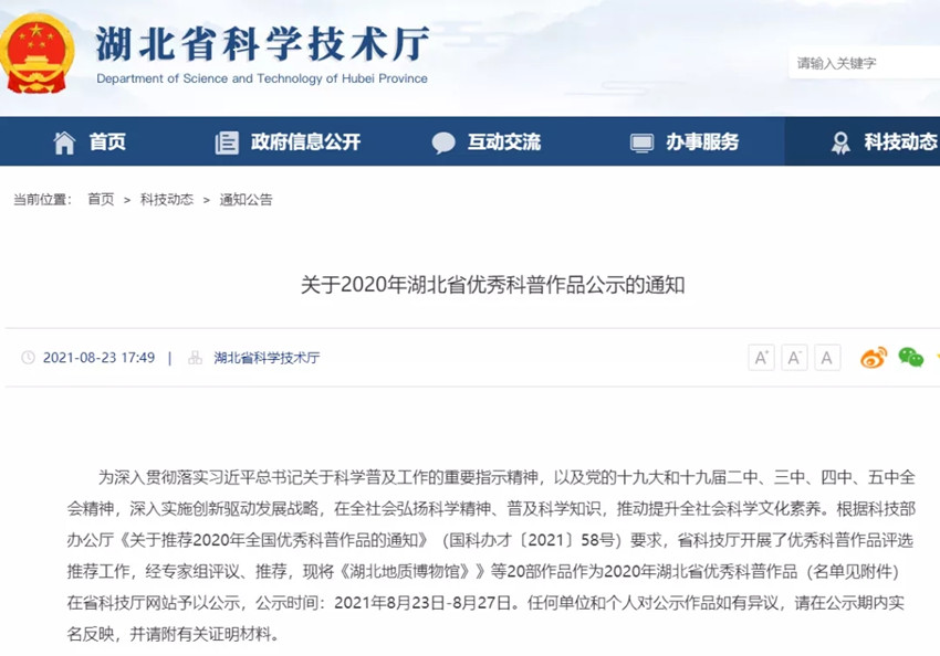 根據科技部辦公廳《關于推薦2020年全國優秀科普作品的通知》(國科辦才〔2021〕58號)要求,省科技廳開展了優秀科普作品評選推薦工作,經專家組評議、推薦,《湖北地質博物館》》等20部作品被評選為2020年湖北省優秀科普作品。其中,長少社《大自然是個數學老師》《100位科學家的中國夢》《中國橋》《中國力量系列》《寫給孩子的病毒簡史》共計5種優秀圖書入選。