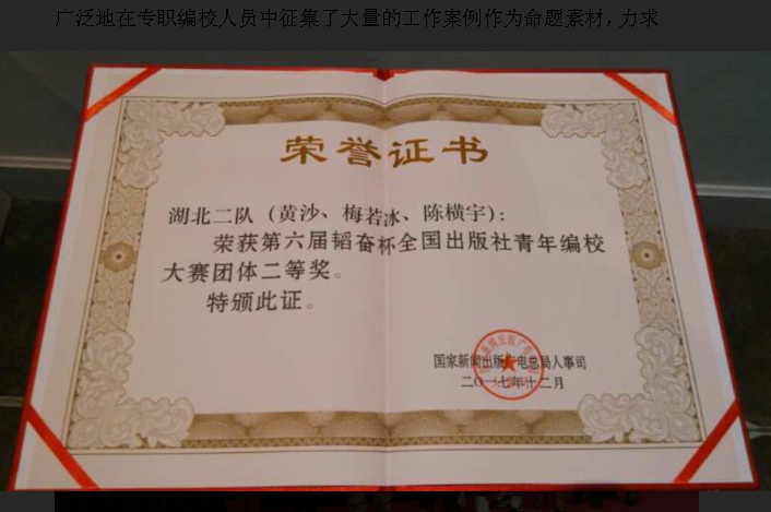 2017年12月2日,由國家新聞出版廣電總局主辦,中國出版協會、韜奮基金會、中國編輯學會承辦的第六屆韜奮杯全國出版社青年編校大賽在京落幕,我社參賽的青年員工陳橫宇所在的湖北二隊榮獲團體二等獎。