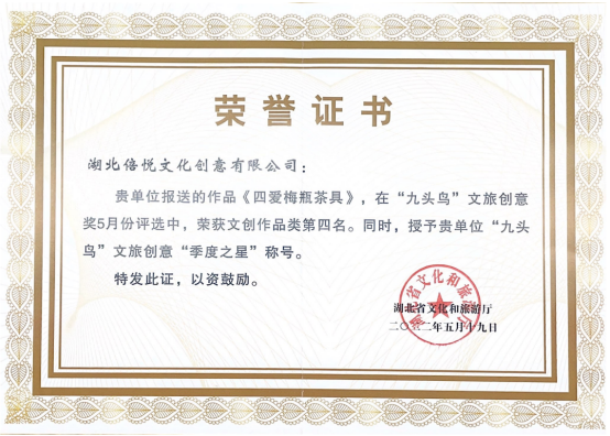 由湖北倍悅文化創(chuàng)意有限公司出品的四季之愛梅瓶茶具在2022年5月“九頭鳥”文旅創(chuàng)意獎中榮獲文創(chuàng)作品類目第四名。同時獲得 “九頭鳥”文旅創(chuàng)意“季度之星”稱號。