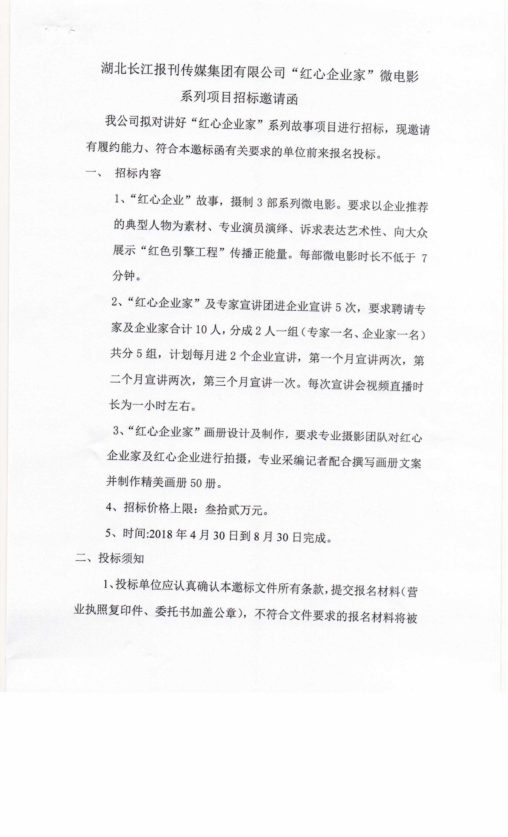 報刊集團“紅心企業家”微電影系列項目招標邀請函及招標文件