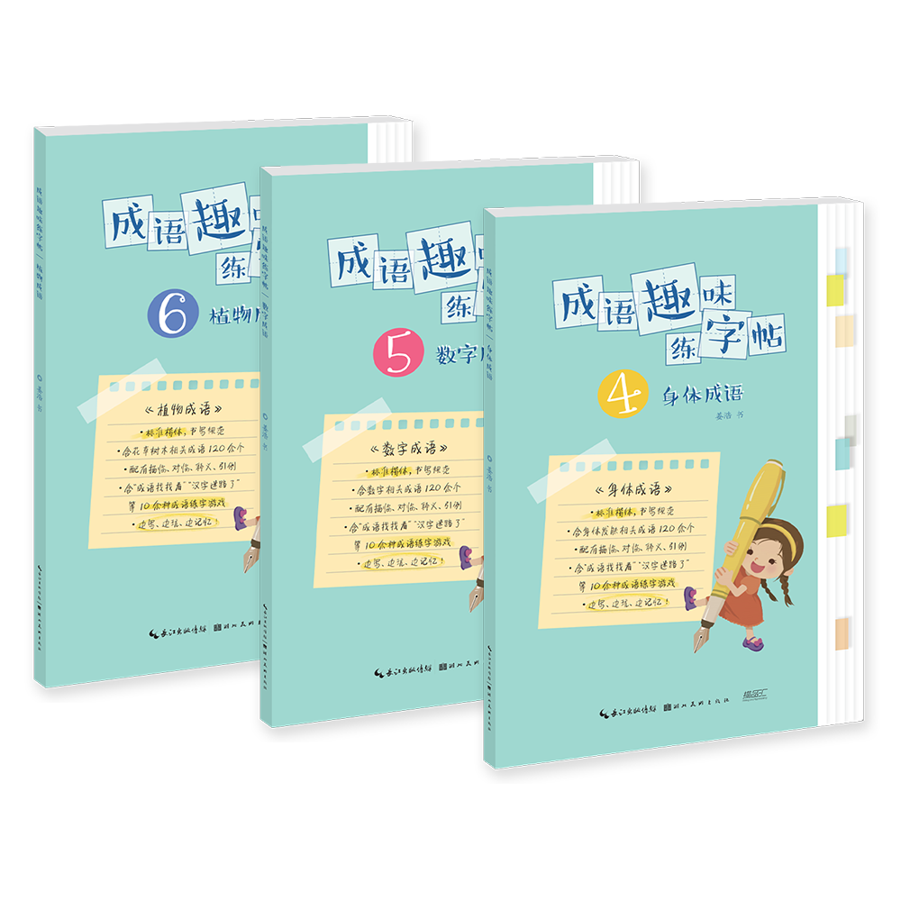 成語趣味練字帖第二輯3本套裝(數字、身體、植物)簡介本套叢書分為9冊,目標讀者是中小學生或有寫字需求的人群。每本書的正文部分包含了成語的釋義、出處和造句,且有田字格以供描臨和對臨;游戲部分包含了十余種成語練字游戲,如成語接龍小迷宮、成語找找看、漢字迷路了、成語急轉彎、成語通八方等。書稿內容豐富有趣,可以提升習字者的寫字興趣,也可以幫助其加強成語知識的積累。《身體家族成語》由包含五官的成語、包含四肢的成語、包含頭腦的成語、包含發膚的成語、包含內臟的成語以及成語游戲幾部分組成。出版單位:湖北美術出版社