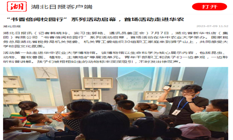 7月7日,湖北省新華書店(集團)有限公司“書香倍閱校園行”系列活動啟幕,首場活動在華中農業大學舉辦。國家稅務總局湖北省稅務局機關黨委、機關青工委組織30組職工家庭來到獅子山上,共同感受大學校園文化氛圍。