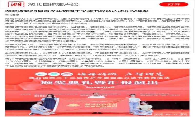 中國新聞出版廣電報報道湖北省第23屆青少年愛國主義讀書教育活動頒獎典禮暨匯報演出8月6日在武漢舉行。