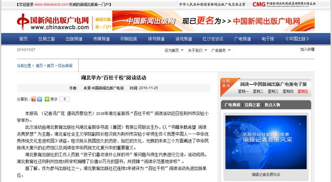 中國新聞出版廣電網:湖北舉辦“百社千?!遍喿x活動
