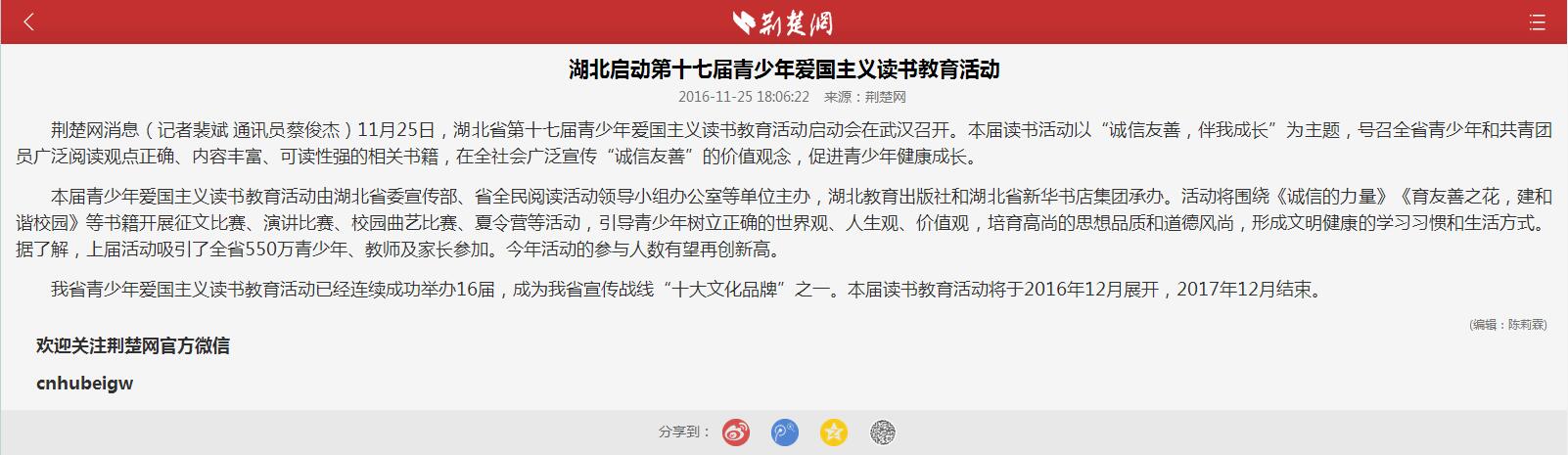 荊楚網:湖北啟動第十七屆青少年愛國主義讀書教育活動