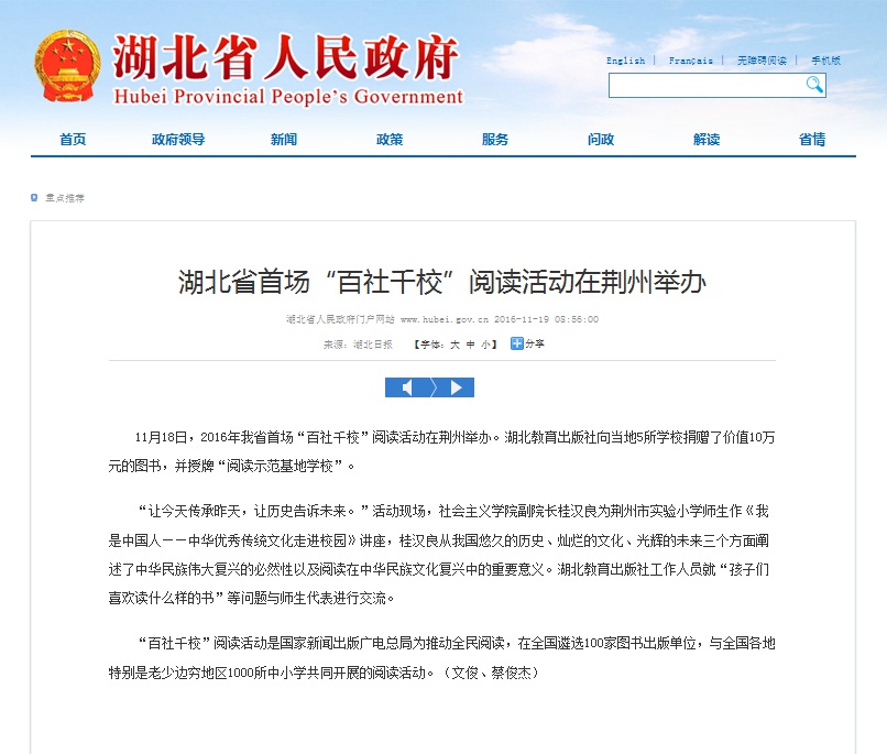湖北省政府官網:湖北省首場“百社千校”閱讀活動在荊州舉辦