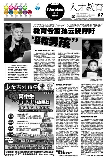 長江傳媒《武漢晚報(bào)專訪長江社新書《懂方法父母成就孩子一生》作者孫云曉》的新聞內(nèi)容介紹: 應(yīng)試教育是成長“殺手” 父愛缺失導(dǎo)致終身“缺鈣” 教育專家孫云曉呼吁 拯救男孩 “男孩危機(jī)日趨嚴(yán)重,正在使中國失去一代男人,最為可怕的是,人們很少意識(shí)到或根本不相信男孩危機(jī)的存在。”中國教育風(fēng)云人物孫云曉在漢接受記者獨(dú)家專訪時(shí),大聲疾呼“拯救男