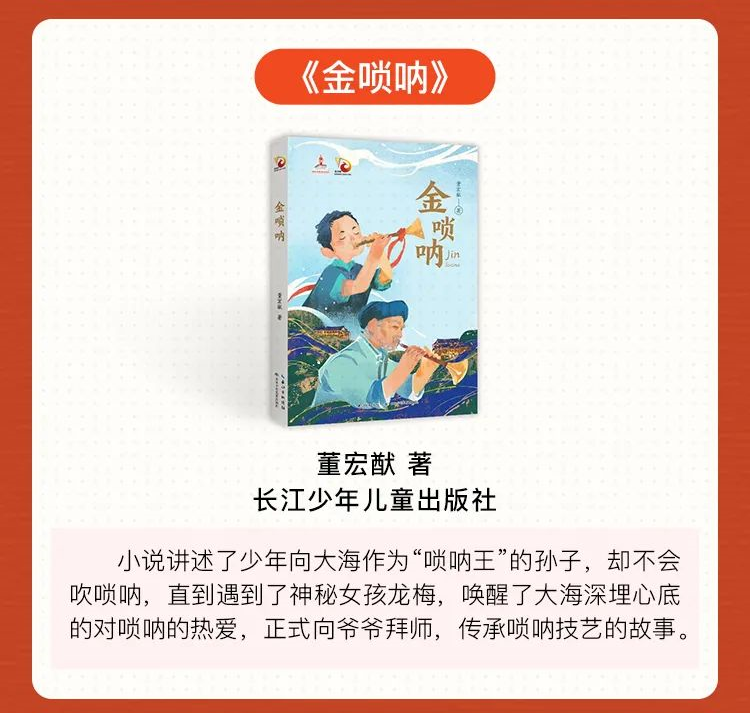 中國圖書評論學會2023年9月“中國好書”榜單發布,由長江少年兒童出版社出版的長篇兒童小說《金嗩吶》(董宏猷 著)入選。這是長少社今年繼《雪線上的邊關》(盧一萍 著)、《漫畫碳中和:孩子需要了解的未來變革》(李劍龍、蘇嵐嵐 著,牛貓小分隊 繪)、《手足琴》(趙麗宏 著)后第四次有圖書入選“中國好書”月度榜單。