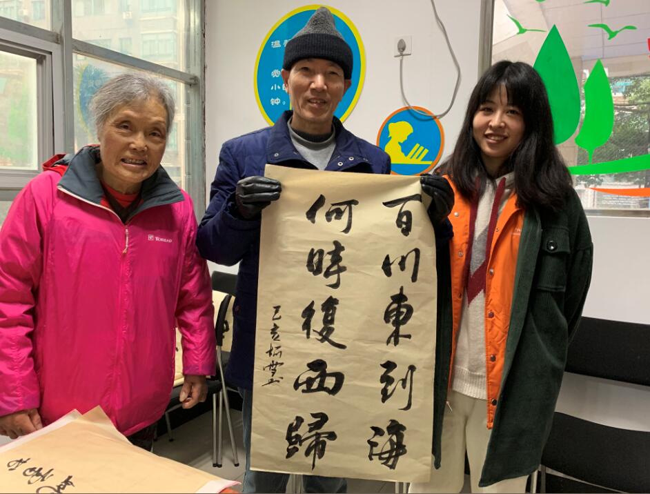 活動現場,針對大家的“零基礎”,青年志愿者們耐心從最基本的書寫姿勢、握筆、運筆進行教學,無論是老年人還是小朋友,都非常認真地學習,可以感受他們對學習書畫濃厚的興趣和喜愛。活動末尾,青年志愿者們已經與社區的群眾建立了濃厚的情誼,他們發揮自身書畫專長,為現場群眾寫字畫畫,拿到精美字畫的人開心地合影,其樂融融。
