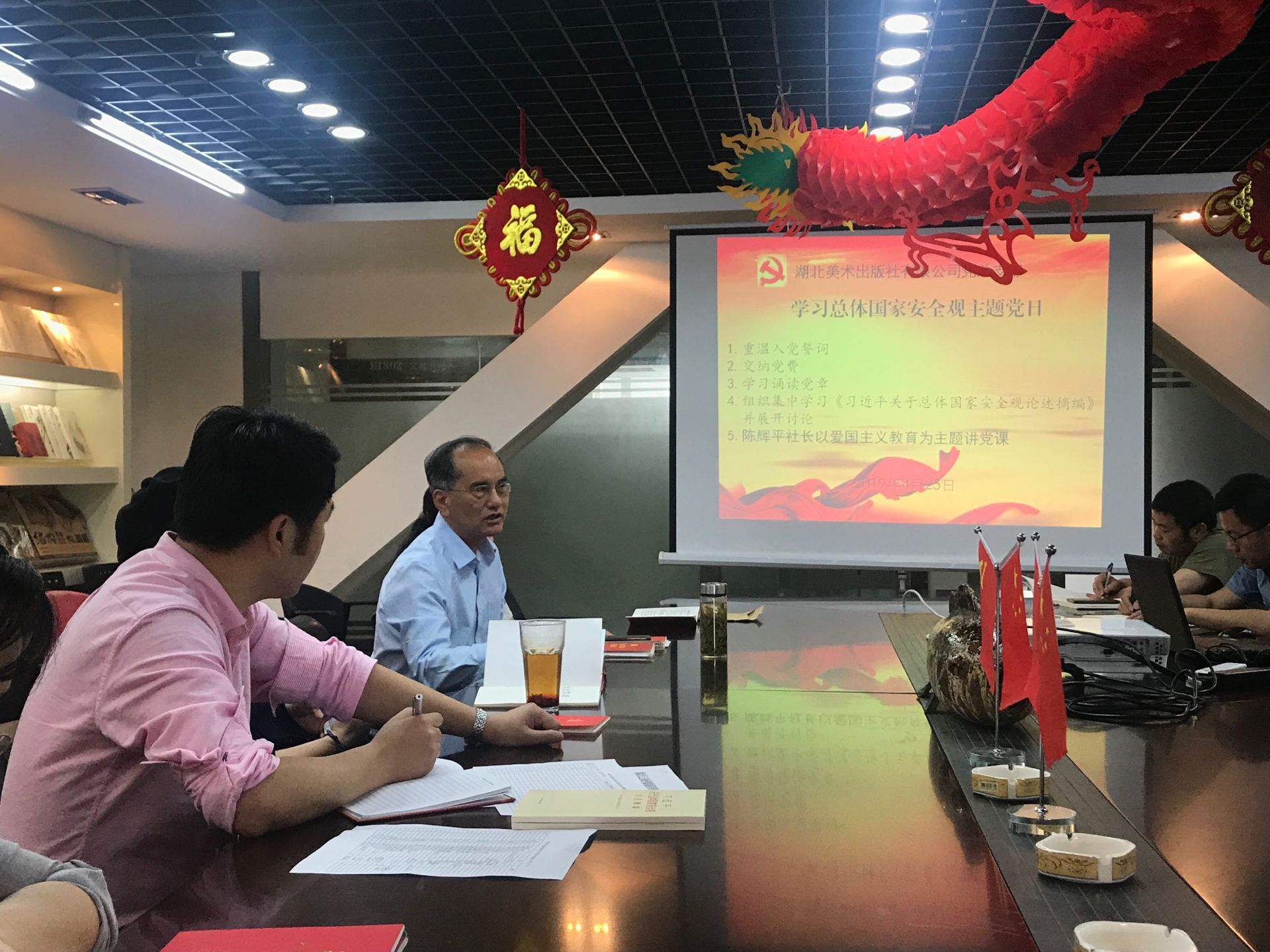4月25日,湖北美術出版社第一黨支部在18樓會議室召開“學習總體國家安全觀”為主題的支部黨日活動,組織集中學習了《習近平關于總體國家安全觀論述摘編》并展開討論。黨總支書記陳輝平以普通黨員身份參加本次主題黨日,并且以愛國主義教育為主題給支部黨員講了一次生動的黨課。