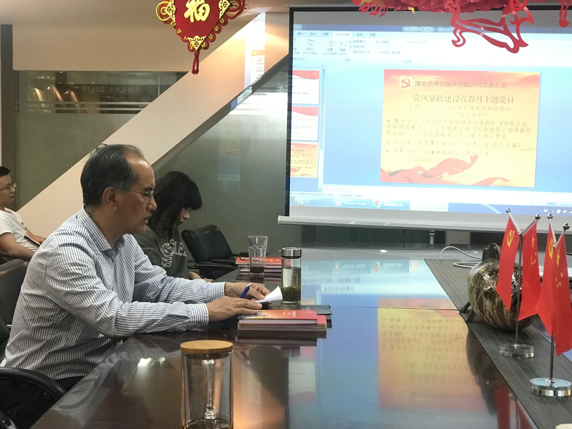 5月22日,湖北美術出版社在18樓會議室召開黨風廉政建設宣教月主題黨日活動,黨員干部和全體職工參會。
