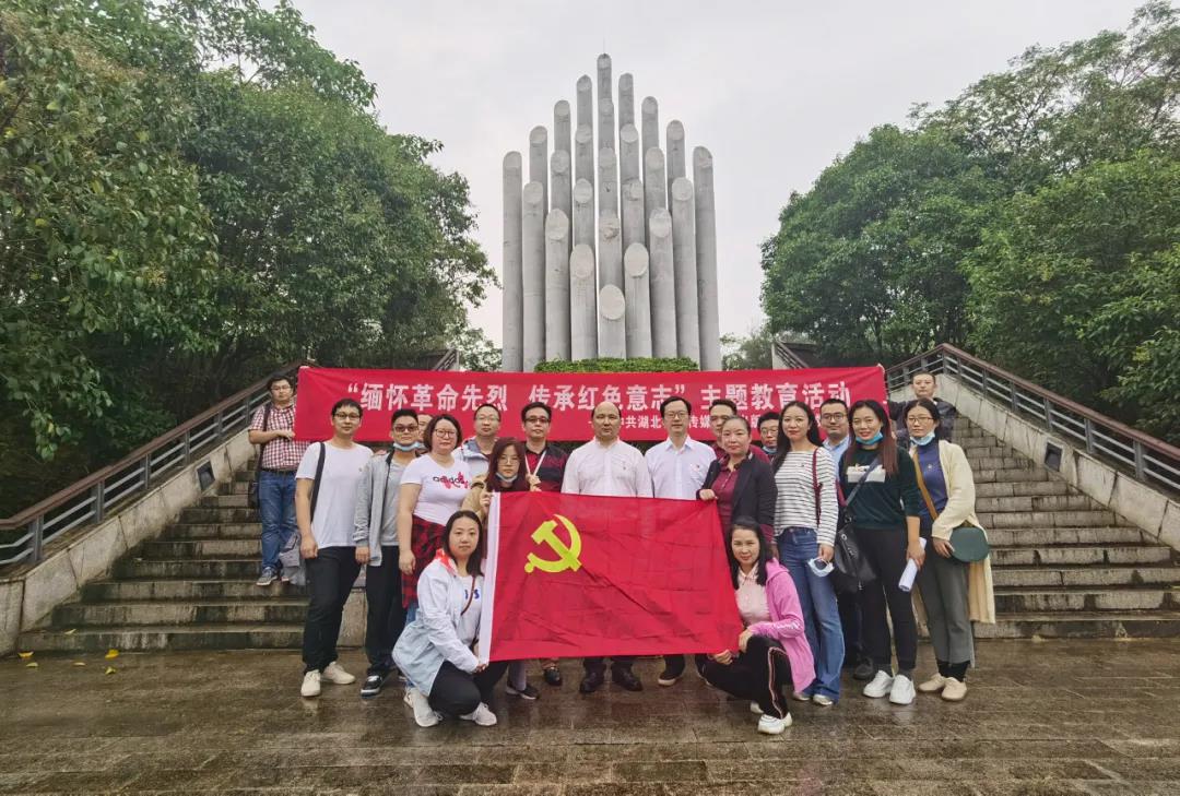 在微微秋雨中,大家拾級而上,來到“中山艦抗日陣亡將士紀念碑”前。長江數字黨支部向革命先烈致敬獻花籃,支部書記胡明亮帶領大家重溫入黨誓詞。
