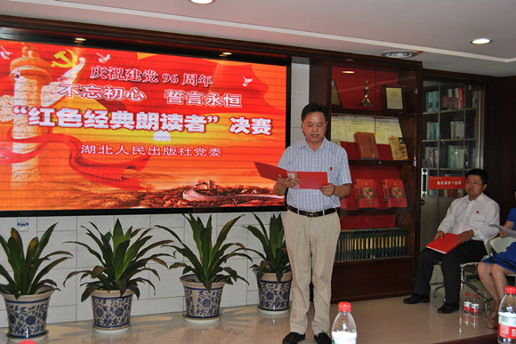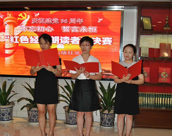 人民社黨委書記姚德海同志首先致辭。他指出,開展“不忘初心誓言永恒——紅色經典朗讀者”活動,是為了慶祝建黨96周年,重溫黨的奮斗歷史,增強全體黨員的紅色記憶,筑牢理想信念的堡壘,推動全社“兩學一做”教育常態化制度化開展,使大家永遠不忘“跟黨走”的初心,永遠牢記和履行入黨時的誓言。姚德海同志還強調指出,人民社開展黨員知識競賽活動、開展“紅色經典朗讀者”活動,目的就是要打造學習型黨組織、學習型企業,推動全社黨員持續深入地學習,不斷地進行理想信念的錘煉,不斷地培植精神家園,不斷地提高黨性修養,并以此來促進編輯出版工作,自覺堅守黨社定位,多出好書,多出精品,用實際行動為黨旗增光添彩!