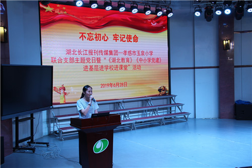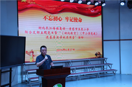 6月28日上午,湖北長江報刊傳媒集團紅三支部書記陳文斌率全體支委及部分黨員代表來到孝感市玉泉小學,開展聯合支部主題黨日暨《湖北教育》《中小學黨建》“進基層、進校園、進課堂”活動,深入學習“不忘初心、牢記使命”主題教育相關精神,以實際行動迎接建黨98周年。