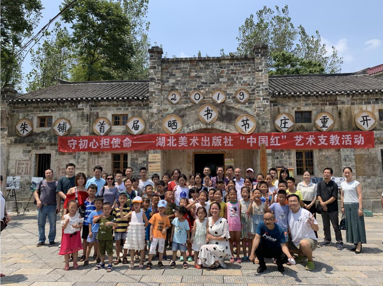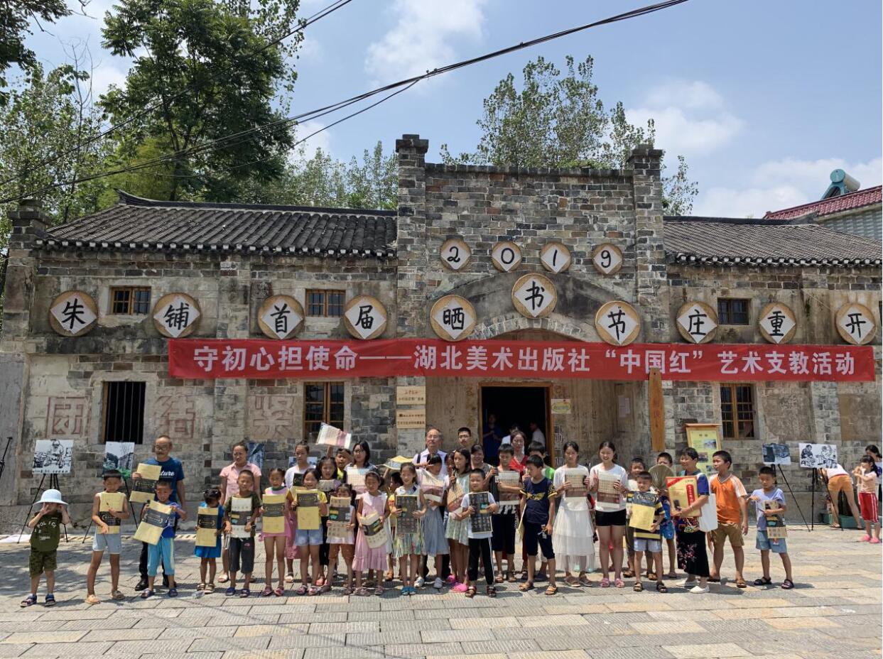 2019年8月8日, 湖北美術出版社有限公司黨總支部書記、總經理陳輝平帶隊,由黨員編輯組成的一支特殊的支教隊伍抵達大冶朱鋪村扶貧基地,在村讀活動室給60余名朱鋪村留守少年兒童和書畫愛好者進行了一場別開生面的書法、國畫藝術支教活動,并確定朱鋪村為首個“湖北美術出版社藝術文化鄉村傳播基地”,現場舉行授牌儀式。集團扶貧工作隊隊長嚴強華,美術社總編輯余杉,美術社副總經理應傳偉、徐禮永,殷祖鎮黨委書記柯紅云,朱鋪村村支書余云沼,朱鋪村委員楊啟河、馮丹丹參加了授牌儀式。