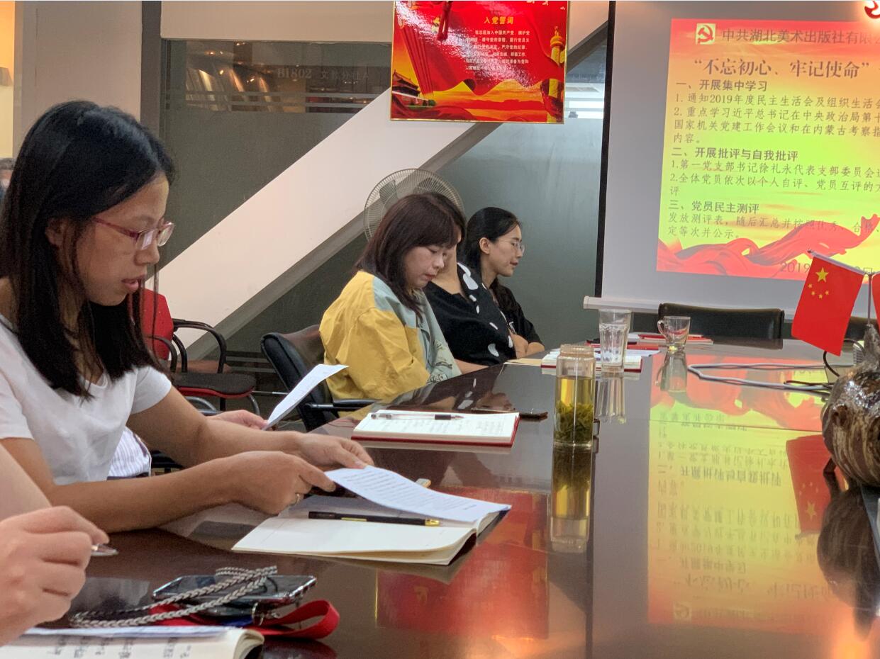 2019年8月30日湖北美術出版社在十八樓會議室舉行以“不忘初心、牢記使命”為主題的專題組織生活會。全體黨員開展了一次集中學習,開展了批評與自我批評,完成了黨員民主測評活動。全體黨員在思想上受到洗禮,取得了良好的效果。