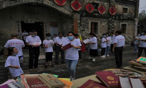 當天“曬書節”重頭戲,是評出了“朱鋪村十佳耕讀之家”,并頒發證書和300元購書獎金;為朱鋪村籍2020年小考、高考第一名學生頒發證書,并分別授以一箱經典書籍一年的閱讀權。因成績尚未放榜,中考成績第一名證書和書箱,將及時補發。小升初第一名學生楊明月,宣讀了《承諾書》,鄭重承諾“一年之內讀完滿箱之書,明年‘曬書節’前,連同書箱完璧歸趙,還回村委會,傳遞給來年狀元和優秀貧困生。”村委會主任余云沼宣讀了《朱鋪村“曬書節”民約》,承諾“曬書節”年年舉辦,代代傳承。大冶市新華書店為村民猜“書謎”提供的200份兌獎書刊。
