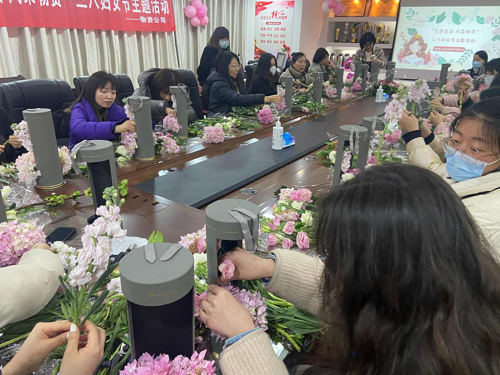 這是一次與花的浪漫邂逅,活動室里播放著舒緩柔和的輕音樂,洋牡丹、桔梗、繡球花、紫羅蘭……各式各樣的新鮮花材整齊地陳列著,處處彌漫著花的芬芳。活動伊始,公司黨總支書記、總經理高漢輝同志致辭,他代表公司領導及男性職工向全體女同胞送上了真摯的節日祝福,宣布花藝教學正式拉開序幕。