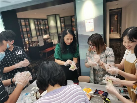 月餅制作環節,來自外文書店的主講老師介紹了冰皮月餅的做法。冰皮月餅較傳統月餅制作流程更加簡單,更容易操作,且健康時尚,制作完成后即可直接食用。員工們面對豐富的原材料都躍躍欲試,在老師指導下將冰皮粉兌上開水揉搓出一個個米團,粘上食用色粉不停揉搓均勻上色,并將餡料包裹其中,抹上防粘粉,放入模具中擠壓成型。不一會工夫,色彩繽紛、口味豐富的月餅便呈現在眼前,大家將月餅一一放入禮品盒,臉上露出了自豪、愉悅的神情。