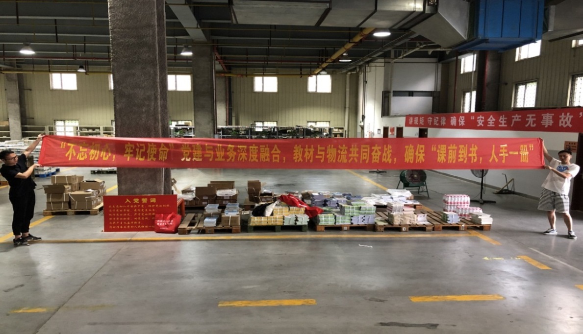 活動中,黨員們首先來到物流教材教輔收貨區,面對黨旗莊嚴宣誓,表示將堅守湖北新華人的初心使命,更好地發揮黨支部戰斗堡壘作用和黨員先鋒模范作用,攻堅克難,保質保量地完成好“課前到書 人手一冊”政治任務。