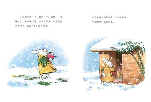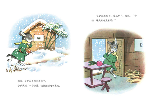 為什么這么多孩子喜歡這部作品?這是一個講述小兔子給好朋友送蘿卜,好朋友們一個個傳遞,最后又回到小兔子家中的故事。從文字中來看,故事語言富于韻律,情節(jié)簡短,借鑒了傳統(tǒng)故事回環(huán)往復的結構。 從圖畫的視角中來談,圖像敘事節(jié)奏清晰,在每次的翻頁中有猜測也有期待,圖畫中更多的秘密期待你們去發(fā)現(xiàn)。這本書的文圖作者可謂是中國文學史和藝術史上的泰斗級人物。迄今為止,《蘿卜回來了》在全球出現(xiàn)了40余個改編本,覆蓋了美國、俄羅斯、日本、法國、德國、西班牙等國家和地區(qū)。被翻改、轉譯、出版和閱讀的次數(shù)之多在我國童書發(fā)展史上可謂獨樹一幟。 日本圖畫書之父松居直先生曾說:“我是在1960年讀到這個故事的,讀過之后,非常震驚。我認為這是一個極好的故事,在世界上比,也算是杰作。我想,孩子們一定會喜歡這本書的,因此我在1965年為日本的孩子們出版了這本書。30年來,這本書一直在賣……我認為這本書恐怕還能賣50年,100年。”