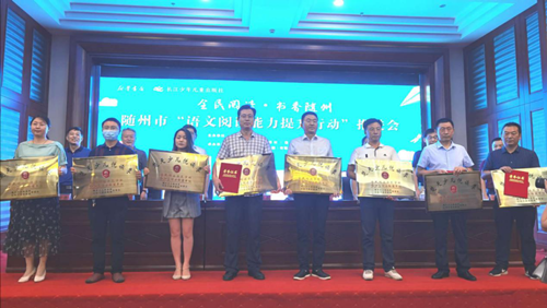 何龍董事長代表長江少年兒童出版社和與會嘉賓一起給隨州市隨縣殷店鎮(zhèn)中心學校、廣水市實驗初中、隨州市外國語學校(南關小學部)、廣水市實驗小學、隨州高新區(qū)季梁學校、隨縣炎帝學校、曾都區(qū)實驗中學、曾都區(qū)實驗小學8所被評為“楚天少兒悅讀季”全民閱讀示范基地的學校授牌頒證。