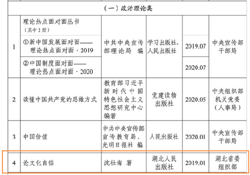 沈壯海教授撰寫的《論文化自信》被列入政治理論類創新教材。該書為中宣部2019年主題出版重點出版物,是一本政治站位高、思想理論性強、全面論述文化自信問題的作品。該書以習近平總書記關于文化自信的一系列重要論述為基礎,以“承古強今,向新而行”八個字提綱挈領,對什么是文化自信、為什么要增強文化自信以及文化自信的科學內涵、價值支撐、重大意義等問題進行了深入闡述,對文化自信與民族精神、文化強國、話語體系等的關系進行深入分析。全書說理透徹,深入淺出,既立足中國現實,又具有學術的厚度,有很強的現實意義。
