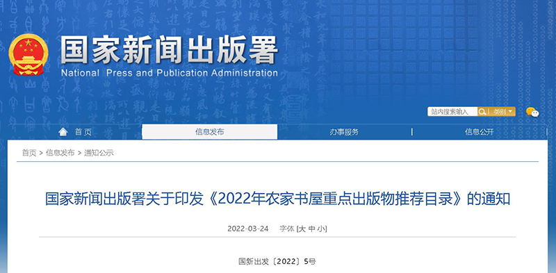 (通訊員 夏萍)3月24日,國家新聞出版署印發《2022年農家書屋重點出版物推薦目錄》,共推薦重點圖書1692種、報紙30種、期刊157種、音像制品和電子出版物101種、少數民族文字圖書205種。2022年主題出版重點出版物、2021年度“中國好書”、2021年度“農民喜愛的百種圖書”自動列入《推薦書目》。長江文藝出版社共有6種圖書入選,其中2種為文化類重點圖書,4種為少兒類重點圖書。李東華作品《小滿》因榮獲2021年度“農民喜愛的百種圖書”自動入選本年度《推薦書目》。