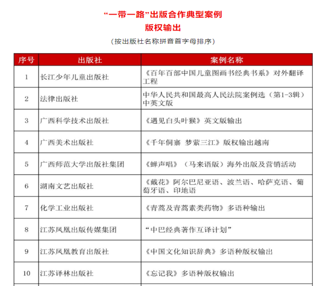 該評(píng)選由中國出版協(xié)會(huì)“一帶一路”出版工作委員會(huì)面向全國各級(jí)各類出版社(集團(tuán))、相關(guān)單位征集,經(jīng)工委會(huì)秘書處初審和指導(dǎo)委員會(huì)終審,共有82個(gè)案例入選。