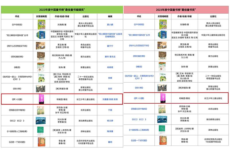 在第58個“國際兒童圖書日”當天,第十一屆中國童書榜隆重發布,長江少年兒童出版社《蘿卜大廈》榮獲2023年度“最佳童書獎”,本書編輯劉嘉鵬、陳穎、吳萌榮獲“最佳童書編輯獎”。