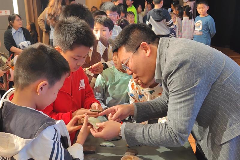 活動結束后,黃洋老師邀請小朋友們到講臺上觸摸他帶來的陶片、瓷片等文物和手鏟等考古工具,孩子們興奮不起,很快就在講座臺上排起了長隊。有的孩子停留在文物前,將每個文物都摸了個遍,久久不愿離去。