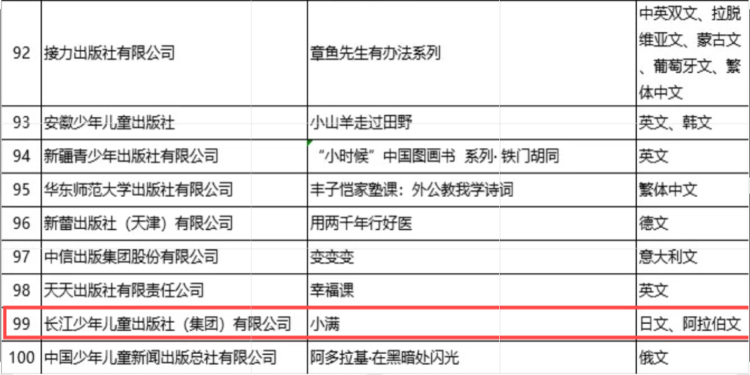 近日,中國出版協(xié)會國際合作出版工作委員會、中國新聞出版研究院、出版參考雜志社公布了第23屆輸出版優(yōu)秀圖書名單。長江少年兒童出版社圖書《小滿》(日文、阿拉伯文)成功入選。