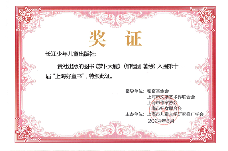 8月14日,由上海市兒童文學研究推廣學會主辦的第十一屆“上海好童書”頒獎儀式在上海友誼會堂舉辦。長江少年兒童出版社的《手足琴》榮獲第十一屆“上海好童書”稱號,《蘿卜大廈》入圍“上海好童書”。