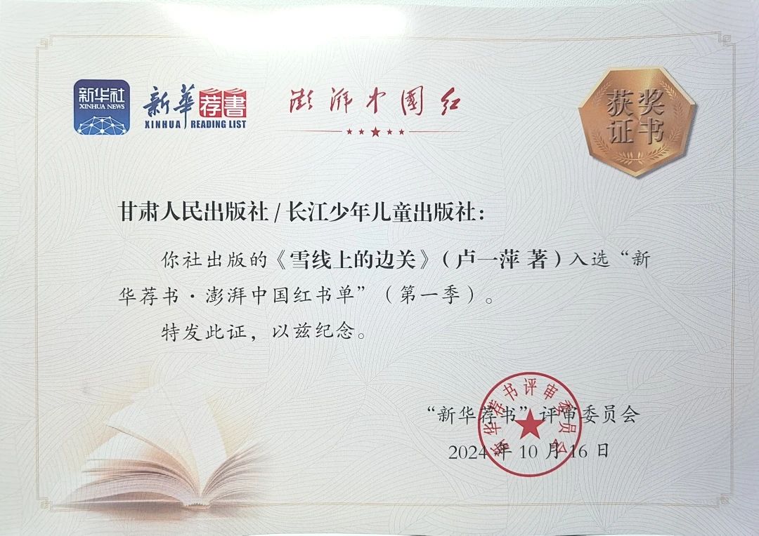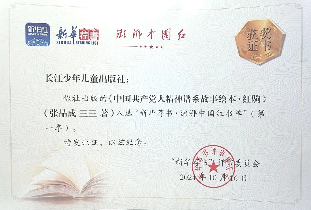 10月16日,“新華薦書?澎湃中國紅書單”(第一季)發布禮在浙江嘉興南湖發布廳舉行。經過前期出版單位推薦、網絡投票和“新華薦書”評審委員會的評議,長江少年兒童出版社出版的《中國共產黨人精神譜系故事繪本·紅駒》和與甘肅人民出版社聯合出版的《雪線上的邊關》,兩種圖書入選該書單。
