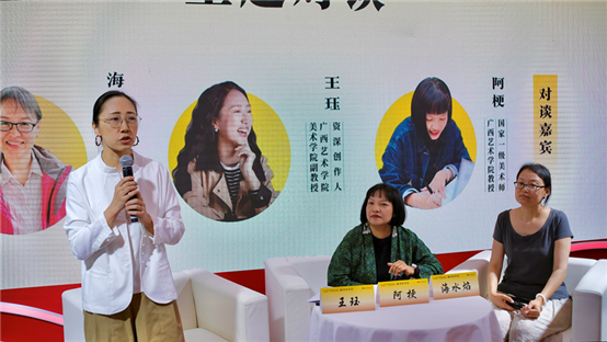 王玨通過多幅畫面深入解讀叢書創作的視覺語言,如采用互動式構圖來生動呈現“龍生九子”的角色關聯,運用漸變色彩來細膩傳達“牛郎織女”的情感變化。