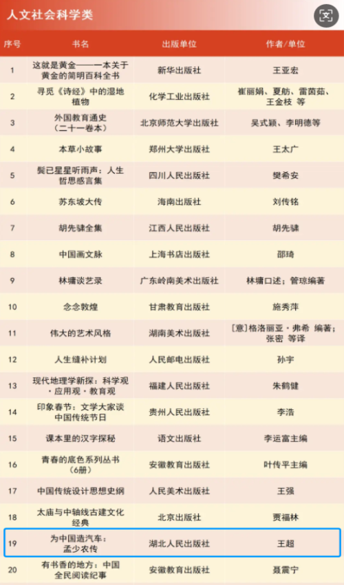 湖北人民社《為中國造汽車:孟少農傳》獲評首屆“韜奮好書”