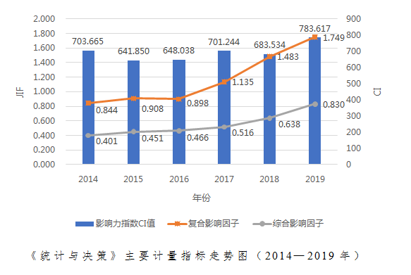 近年來,《統計與決策》學術影響力持續提升,復合影響因子和綜合影響因子分別由2014年的0.844和0.401提高到2019年的1.749和0.830。各項學術計量指標均創新高。