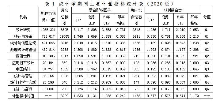 近日,中國知網CNKI與中國科學文獻計量評價研究中心聯合發布《中國學術期刊影響因子年報(人文社會科學?2020版)》(簡稱《年報》),《統計與決策》期刊質量與影響力綜合指數已連續6年位列統計學期刊Q1區。