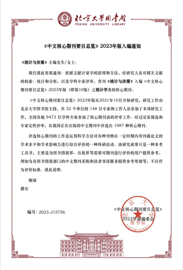 近日,北京大學(xué)圖書館發(fā)布《中文核心期刊要目總覽》2023年版。依據(jù)文獻(xiàn)計(jì)量學(xué)的原理和方法,對(duì)相關(guān)文獻(xiàn)進(jìn)行檢索、統(tǒng)計(jì)和分析,經(jīng)過(guò)定量篩選和專家定性評(píng)審,從我國(guó)正式出版的中文期刊中評(píng)選出核心期刊。《統(tǒng)計(jì)與決策》雜志入編《中文核心期刊要目總覽》2023年版(即第10版)的統(tǒng)計(jì)學(xué)類核心期刊,已是自1992年首次入選后該刊第十次入選全國(guó)中文核心期刊。也是繼該刊在本年度第十次入選“CSSCI來(lái)源期刊”、第八次進(jìn)入“中國(guó)最具國(guó)際影響力學(xué)術(shù)期刊”榜單后的又一大喜訊。