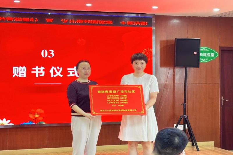 黃燕代表長江教育傳媒集團向廣埠屯社區捐贈了《小學生天地》《初中生天地》《幼兒天地》《少年寫作》等精品學生期刊,為社區的少年兒童送去豐富的精神食糧。