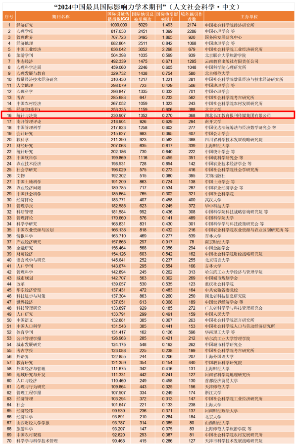 12月24日,由中國知網、清華大學圖書館聯合研制的《中國學術期刊國際引證年報》(2024版)正式發布,湖北長江傳媒統計與決策學術傳播有限公司《統計與決策》榮膺“2024中國最具國際影響力學術期刊”,位列人文社科中文期刊第16位,居統計學期刊第1位。