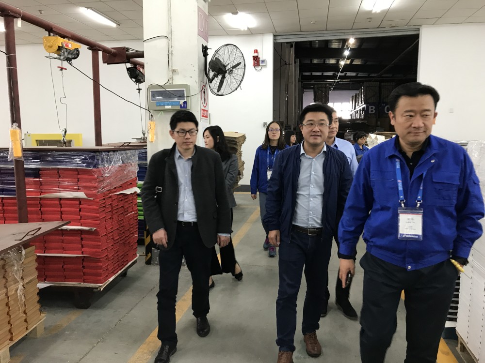 愛德公司總經(jīng)理劉磊(前右)陪同參觀印刷廠房
