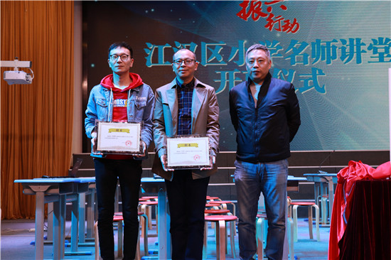 江漢區(qū)教育局黨委書記、局長(zhǎng)唐一飛,黨委委員、副局長(zhǎng)張惠君,湖北長(zhǎng)江報(bào)刊傳媒集團(tuán)黨委書記、董事長(zhǎng)肖昌斌,黨委委員、副總經(jīng)理黃燕,北湖小學(xué)校長(zhǎng)范永歲以及江漢區(qū)200多位教師代表出席了名師講堂活動(dòng)開幕式。開幕式現(xiàn)場(chǎng),唐一飛和肖昌斌共同為“語文振興行動(dòng)”江漢區(qū)小學(xué)名師講堂掲幕,并和師生們一起觀摩了名師講堂的第一講。
