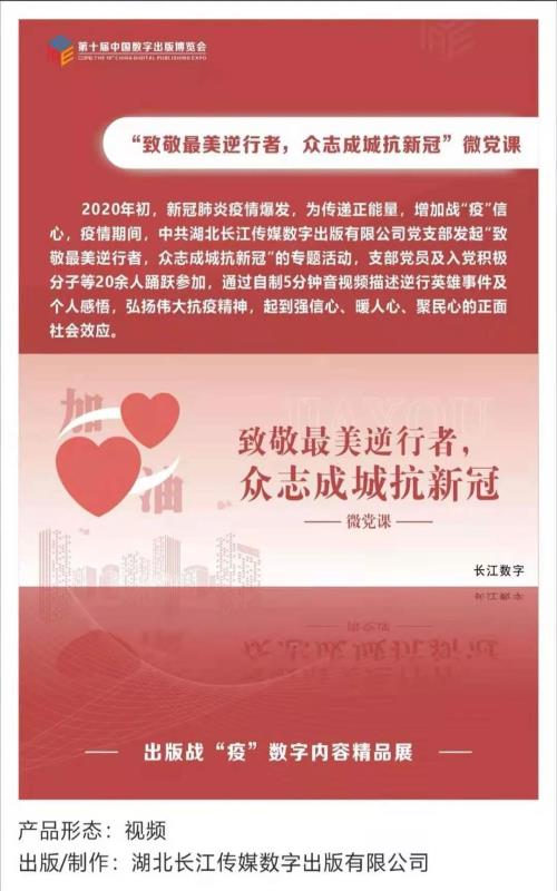 長江數字“致敬最美逆行者,眾志成城抗新冠”微黨課展示于出版戰“疫”展區,以視頻的形式傳遞戰“疫”故事。該微黨課活動由公司黨支部發起,支部黨員及入黨積極分子等20余人踴躍參加,大家自制5分鐘音視頻描述逆行英雄事件及個人感悟,弘揚偉大抗“疫”精神。