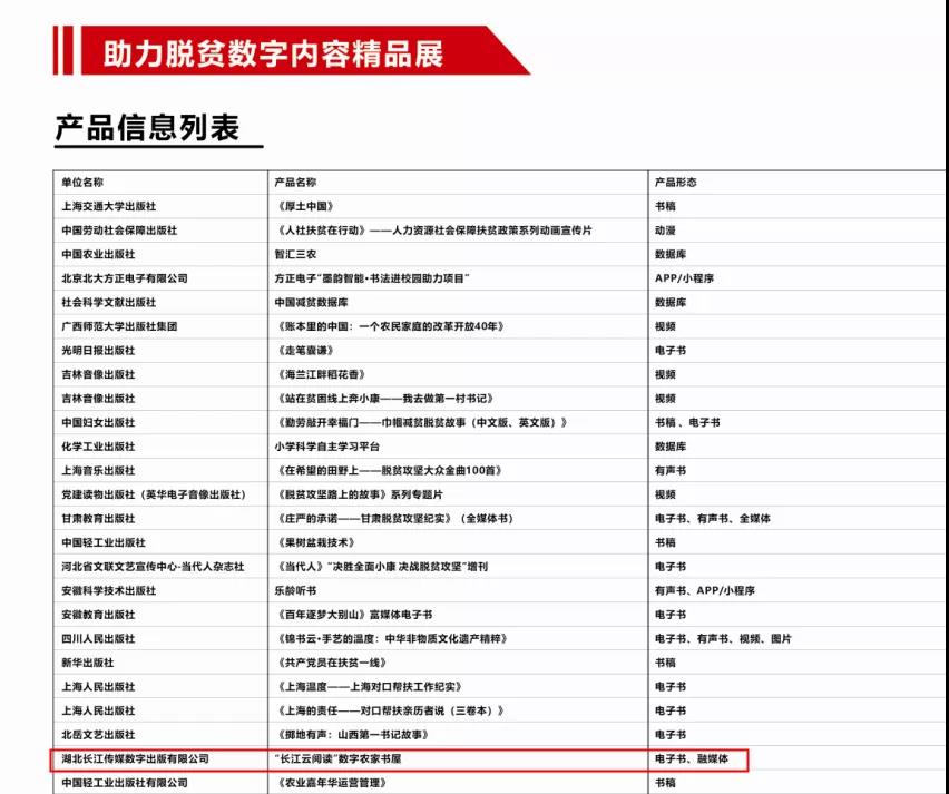 12月21日,由國家新聞出版署與北京市人民政府共同指導,中國新聞出版研究院與北京市委宣傳部(北京市新聞出版局)聯合主辦的第十屆中國數字出版博覽會于在北京國際會議中心開幕。長江數字“長江出版智云”獲評2019-2020年度數字出版優秀品牌,“致敬最美逆行者,眾志成城抗新冠”微黨課、“長江云閱讀”數字農家書屋分別亮相本屆數博會出版戰“疫”展區、助力脫貧展區。