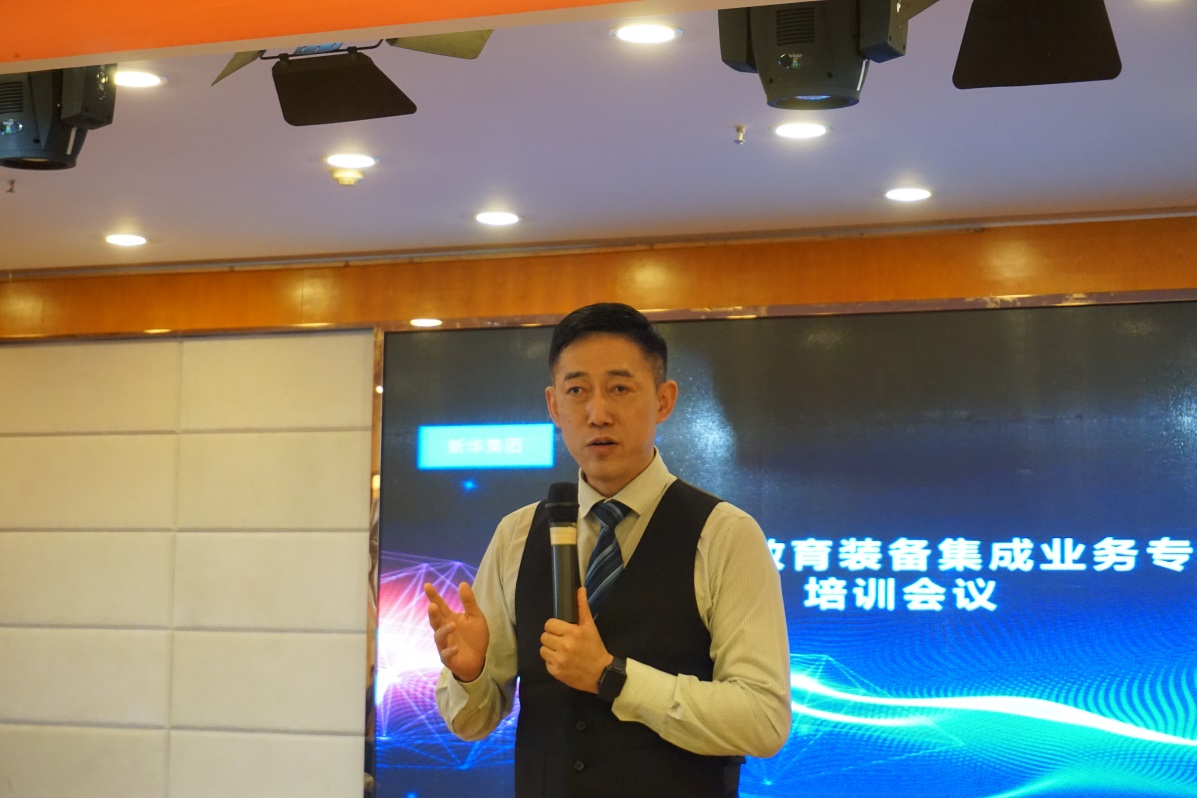 文教公司經理韓東進從推進情況、團隊建設、下一步工作著力點等方面,就新高考業務進行了講解,并作出工作部署;副經理何立從任務、政策、策略、風控等方面對教育裝備集成業務作了介紹并提出要求。