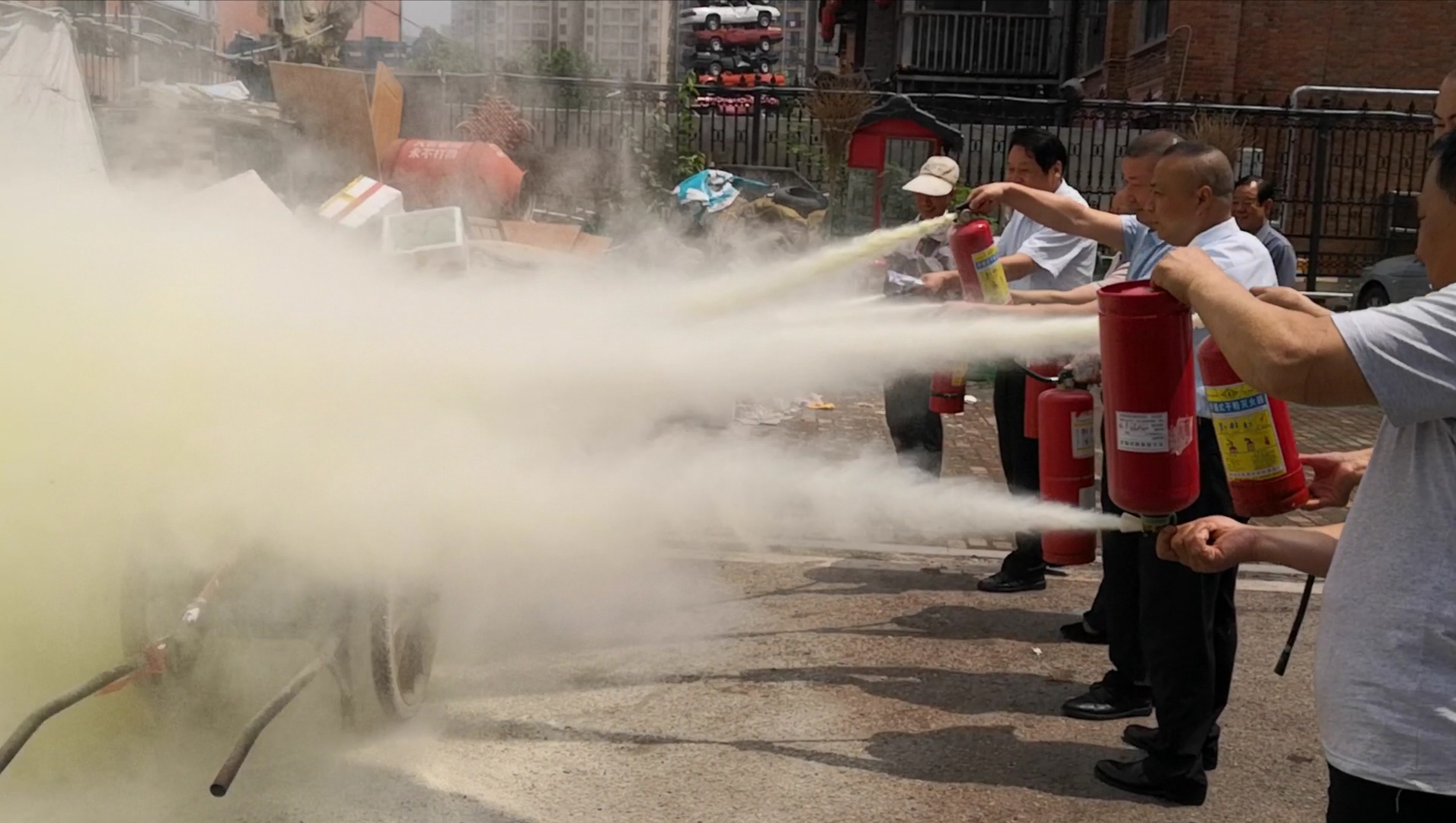 聽完講座后,曾教官及片區李警官現場指導大家使用滅火器撲滅初期火情。